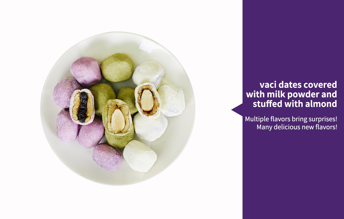 Specially selected red dates with thin skin and full-body, paired with almonds or dried blueberries from vaci organic blueberry farm.
