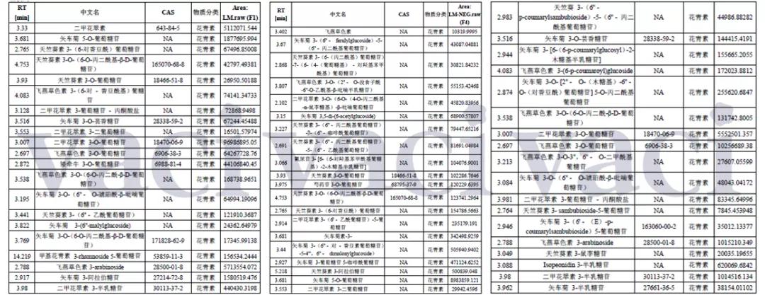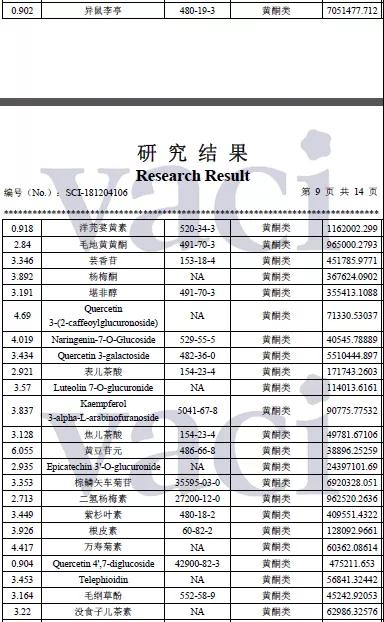 除了花青素,黄酮类共有45项的检测结果,占比22%左右,也是相当高的含量。
