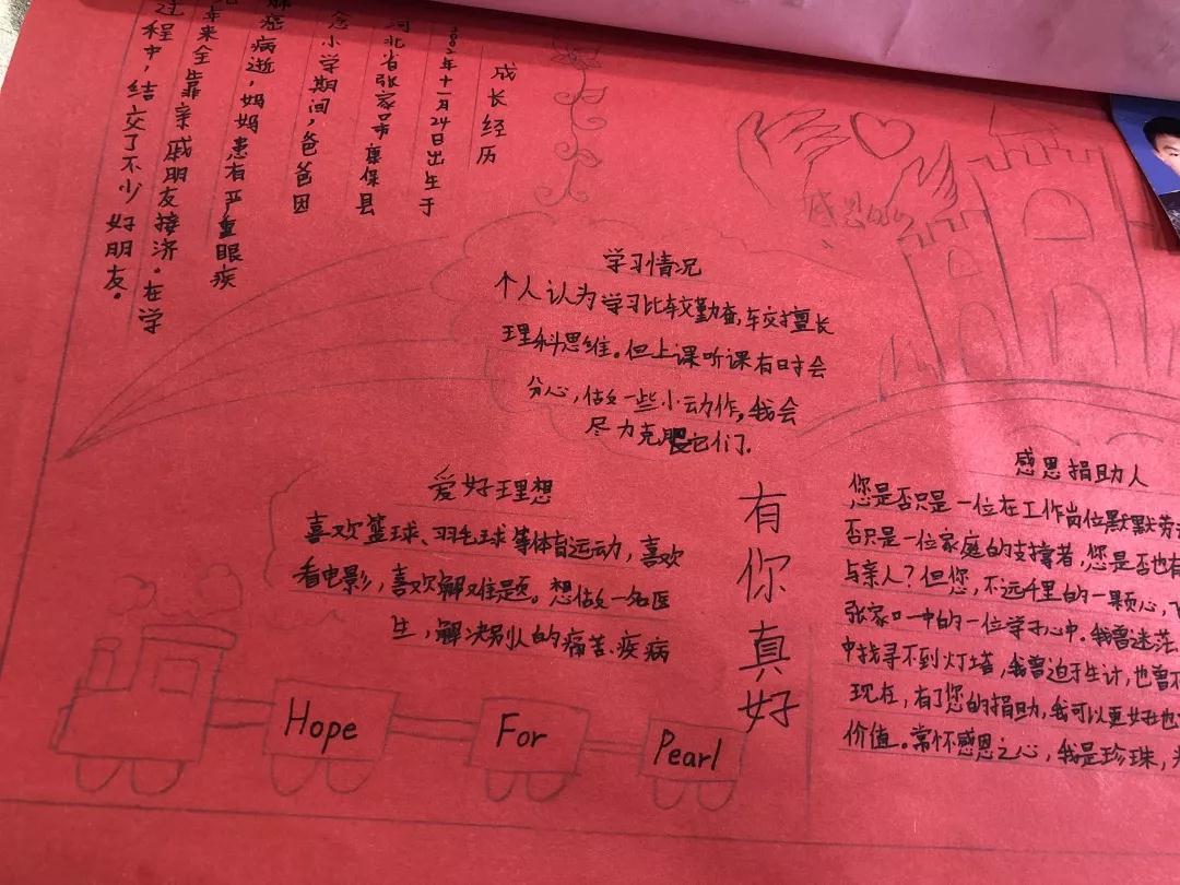 “小学期间父亲病逝,母亲患有严重眼疾,几年来只能靠亲戚接济。我曾迷茫孤独,迫于生计,不知所措,直到您不远千里的一颗心飞到了我这里,您的捐助让我可以更好地实现自己的价值。常怀感恩之心,我是珍珠,为爱而生!”