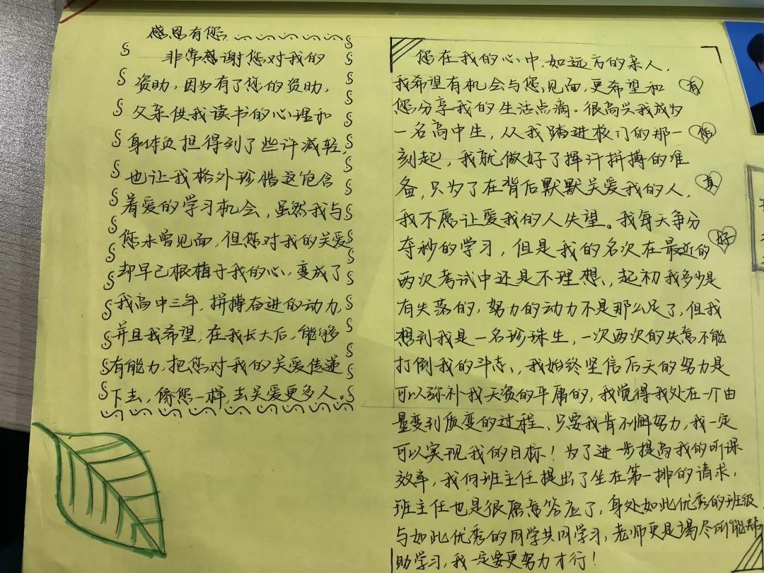 “您对我不仅仅是物质上的资助,更是心灵上的鼓舞。今天我备受呵护,明天我愿化为泥土,去把来年的新芽守护。”